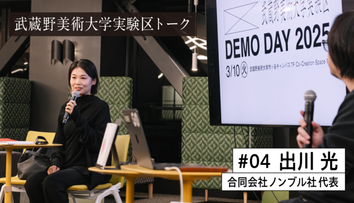 2026年3月10日(火)に開催された「武蔵野美術大学実験区 DEMO DAY 2025」。トークセッションでは、クラウドファンディングサービス「CAMPFIRE」の立ち上げメンバーであり、合同会社ノンブル社代表の出川光さんをお招きし、「わからなさを抱えたままのビジネスアイデアで、資金調達は可能なのか?」をテーマに、さまざまなお話をうかがいました。